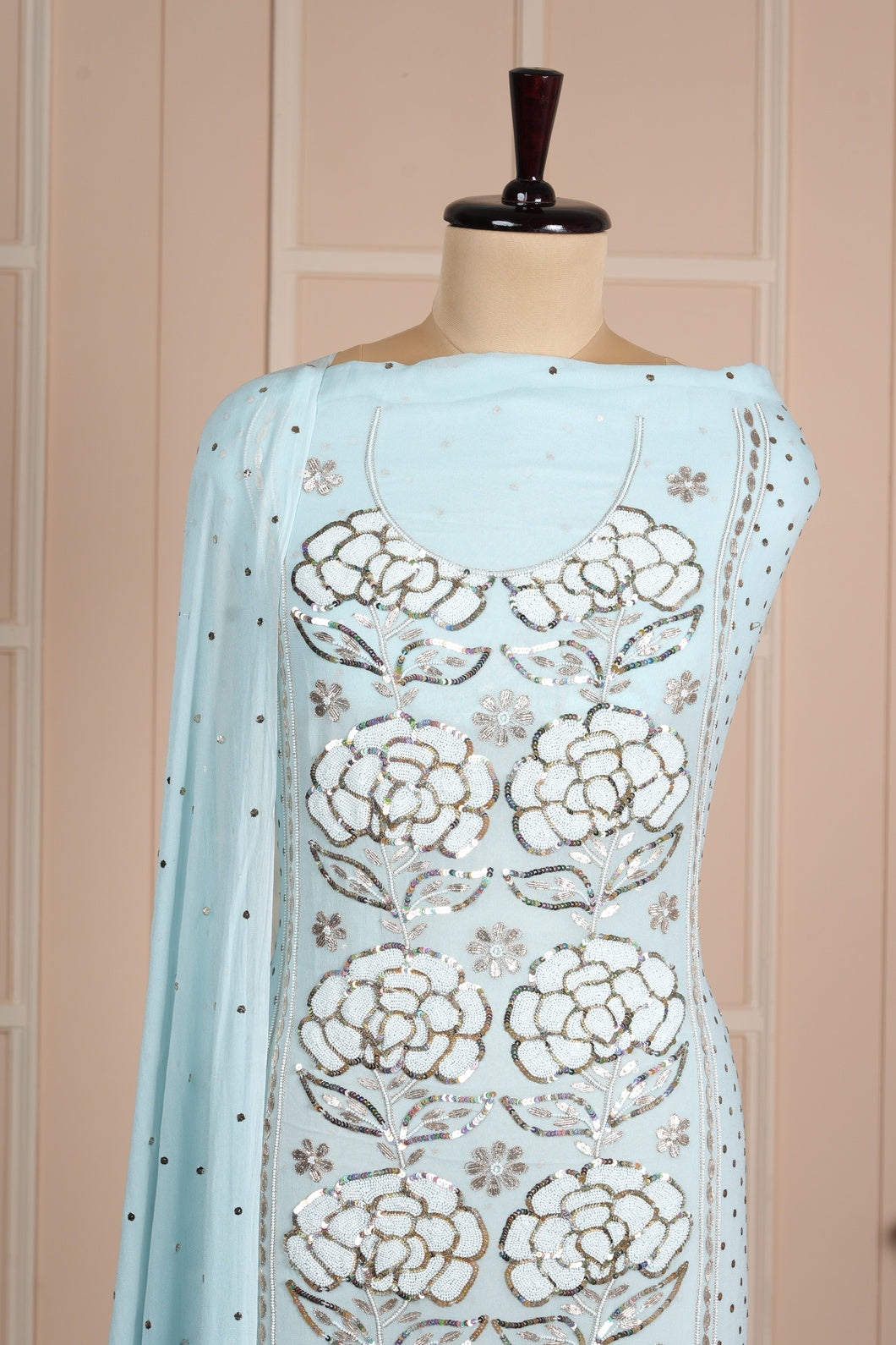 Colour- Pastel blue Kurta and dupatta fabric- Georgette Bottom fabric- Crepe Lining not included Washcare- Dryclean