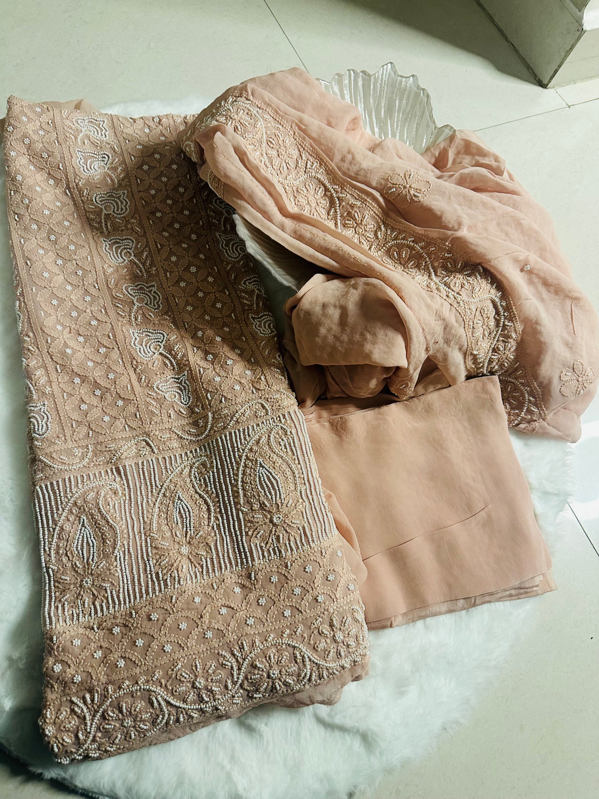This Pearl work Chikankari Suit is a graceful expression of timeless elegance and refined craftsmanship. Handcrafted with intricate Chikankari embroidery, each motif reflects the delicate artistry of traditional needlework, enhanced by the subtle shimmer of pearl embellishments. The soft, breathable fabric drapes beautifully, offering both comfort and sophistication. Every detail—from the fine threadwork to the pearls—creates a perfect masterpiece.