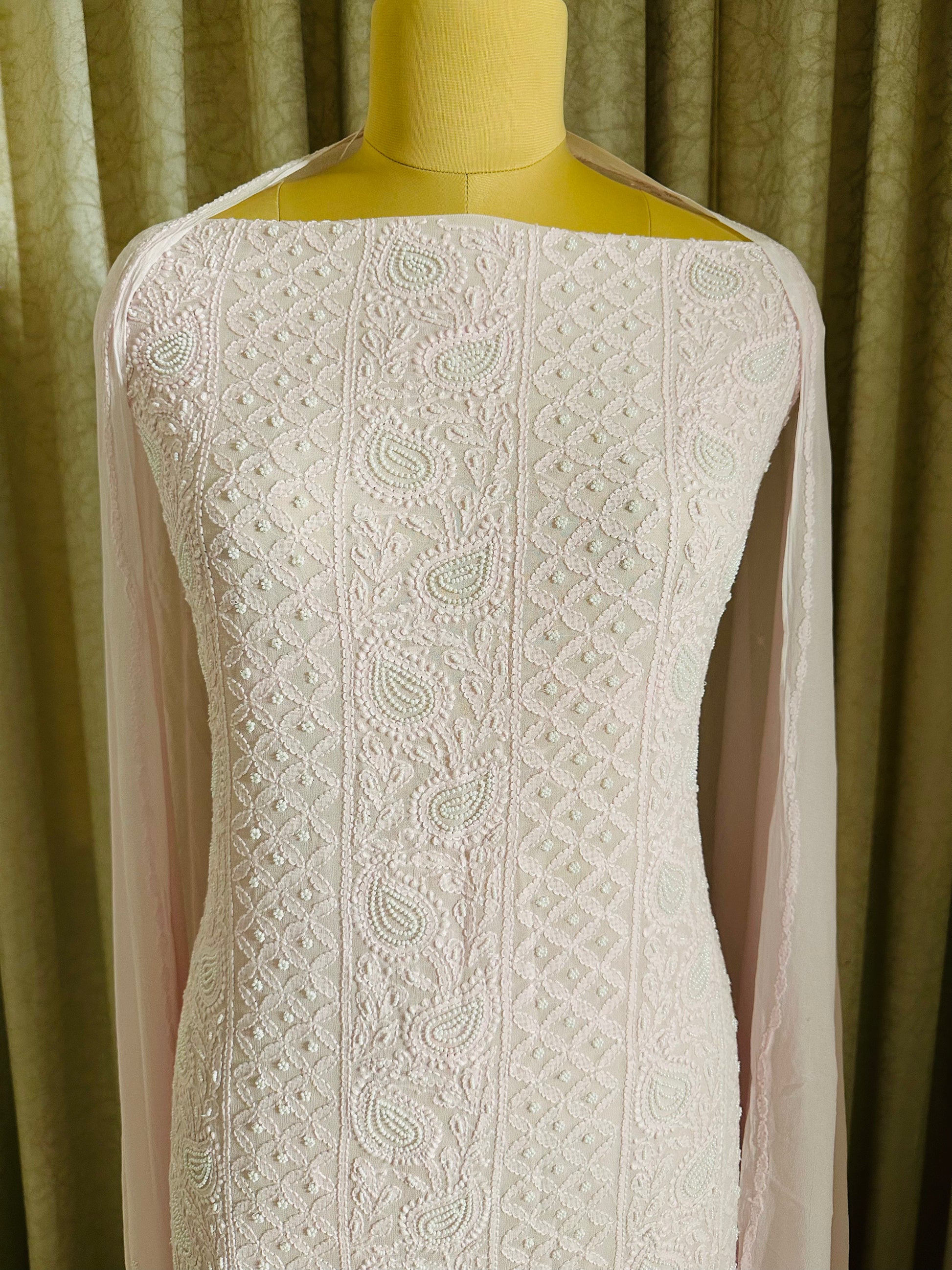 This Pearl work Chikankari Suit is a graceful expression of timeless elegance and refined craftsmanship. Handcrafted with intricate Chikankari embroidery, each motif reflects the delicate artistry of traditional needlework, enhanced by the subtle shimmer of pearl embellishments. The soft, breathable fabric drapes beautifully, offering both comfort and sophistication. Every detail—from the fine threadwork to the pearls—creates a perfect masterpiece.