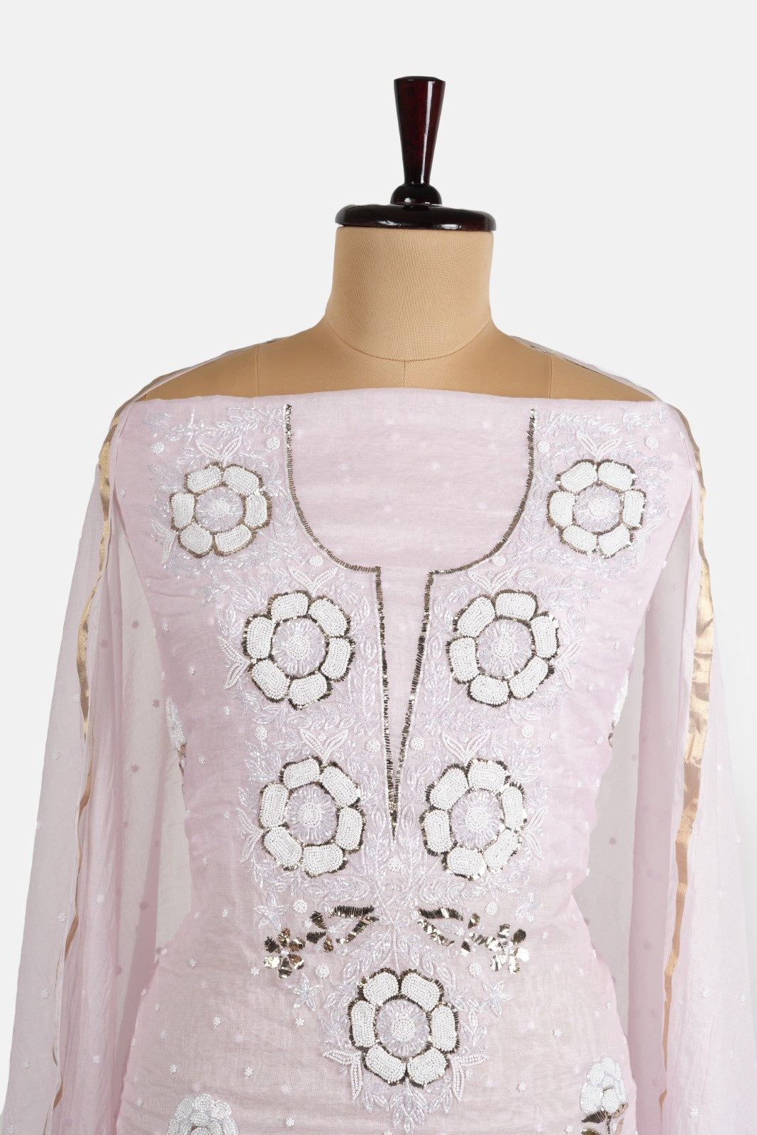The suit is a symphony of elegance, delicacy, and timeless charm. Crafted from the finest pure mulmul fabric, it drapes with feather-light grace, offering an ethereal softness that feels effortlessly luxurious. The ensemble is adorned with intricate Mukaish work—tiny metallic accents that glimmer like scattered stardust—beautifully complemented by luminous pearl embellishments that add a touch of refined sophistication.